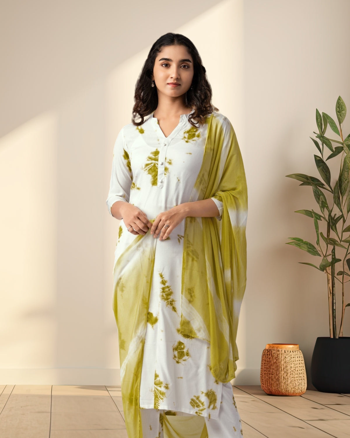 White & Yellow Tie-Dye Print Rayon Kurta Set with Dupatta