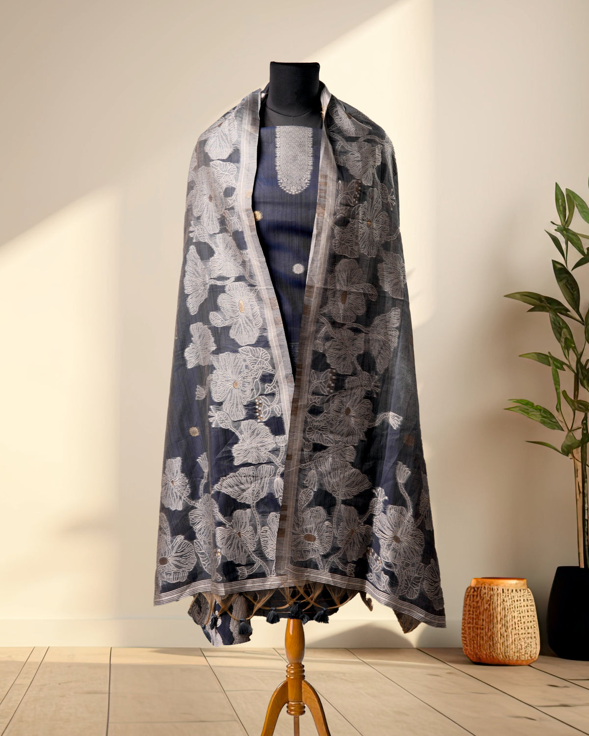 Elegant Grey Cotton Unstitched Suit with Black Floral Print and Printed Dupatta