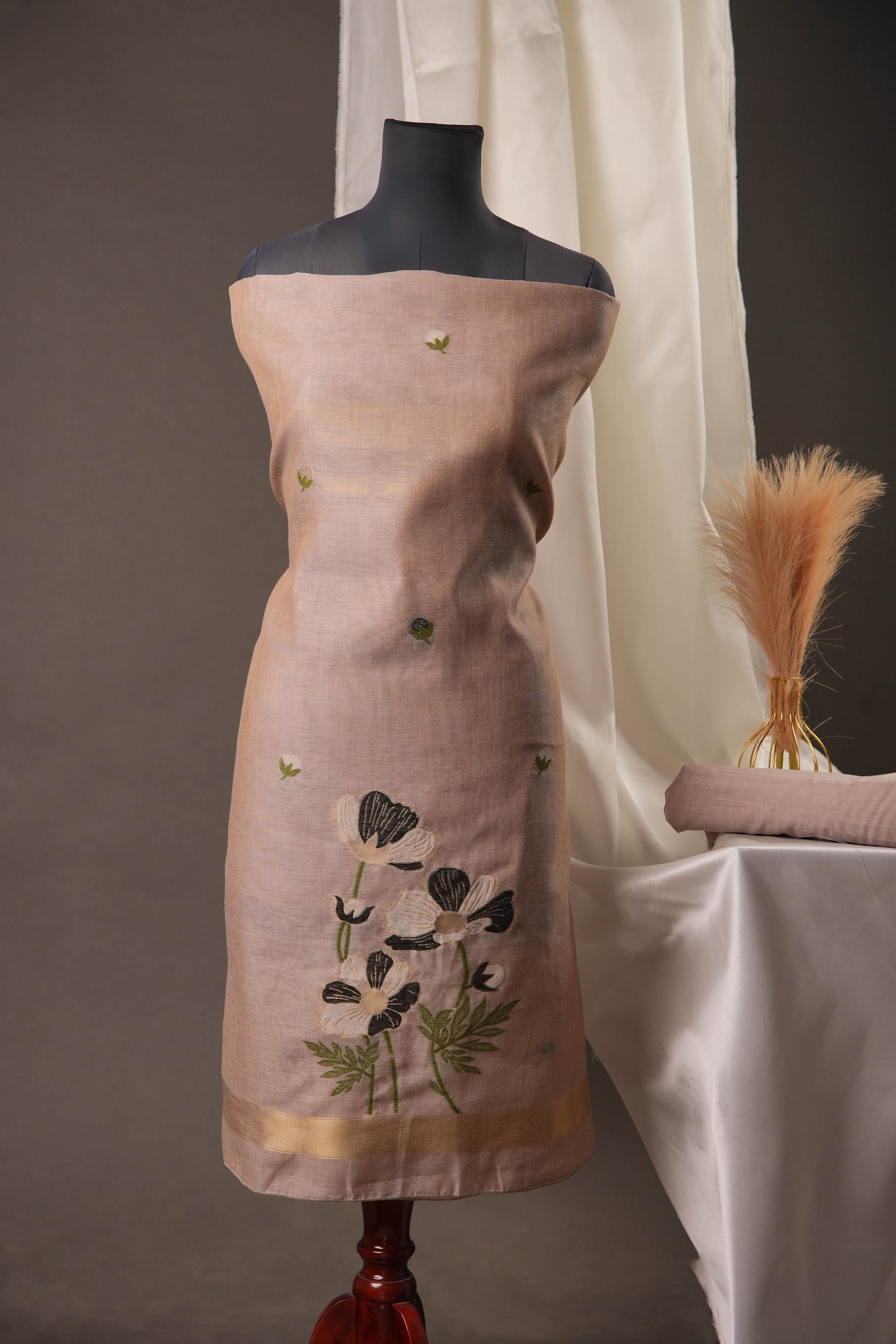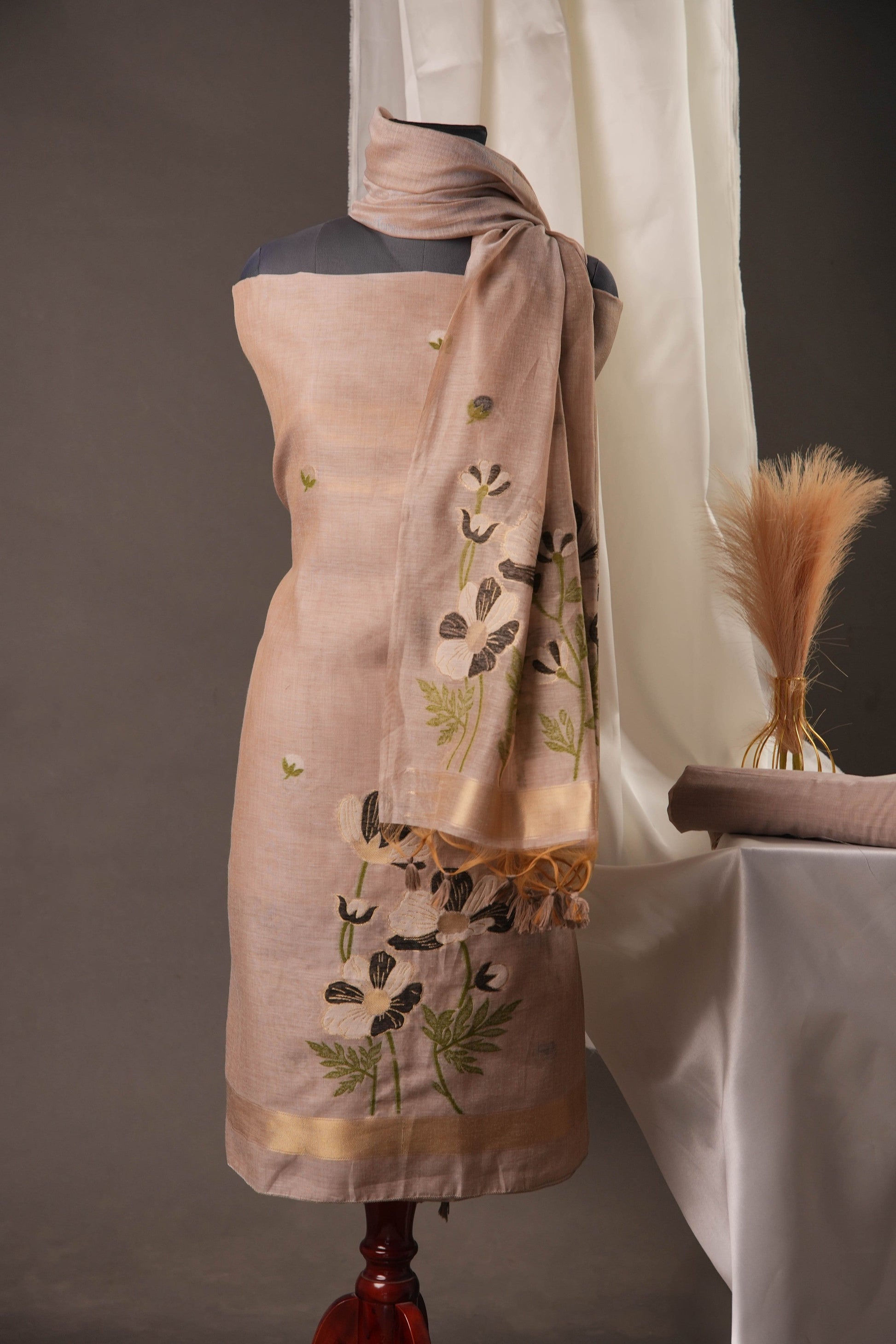 This elegant grey unstitched suit set is crafted from rich Muga cotton and adorned with striking black & cream floral weaving on the top, offering a refined contrast against the soft grey base. The matching Muga cotton dupatta features similar floral woven patterns and is finished with graceful tassel detailing, adding movement and ethnic charm. Paired with a comfortable cotton bottom fabric, this set is ideal for graceful festive wear and traditional styling with a modern touch.