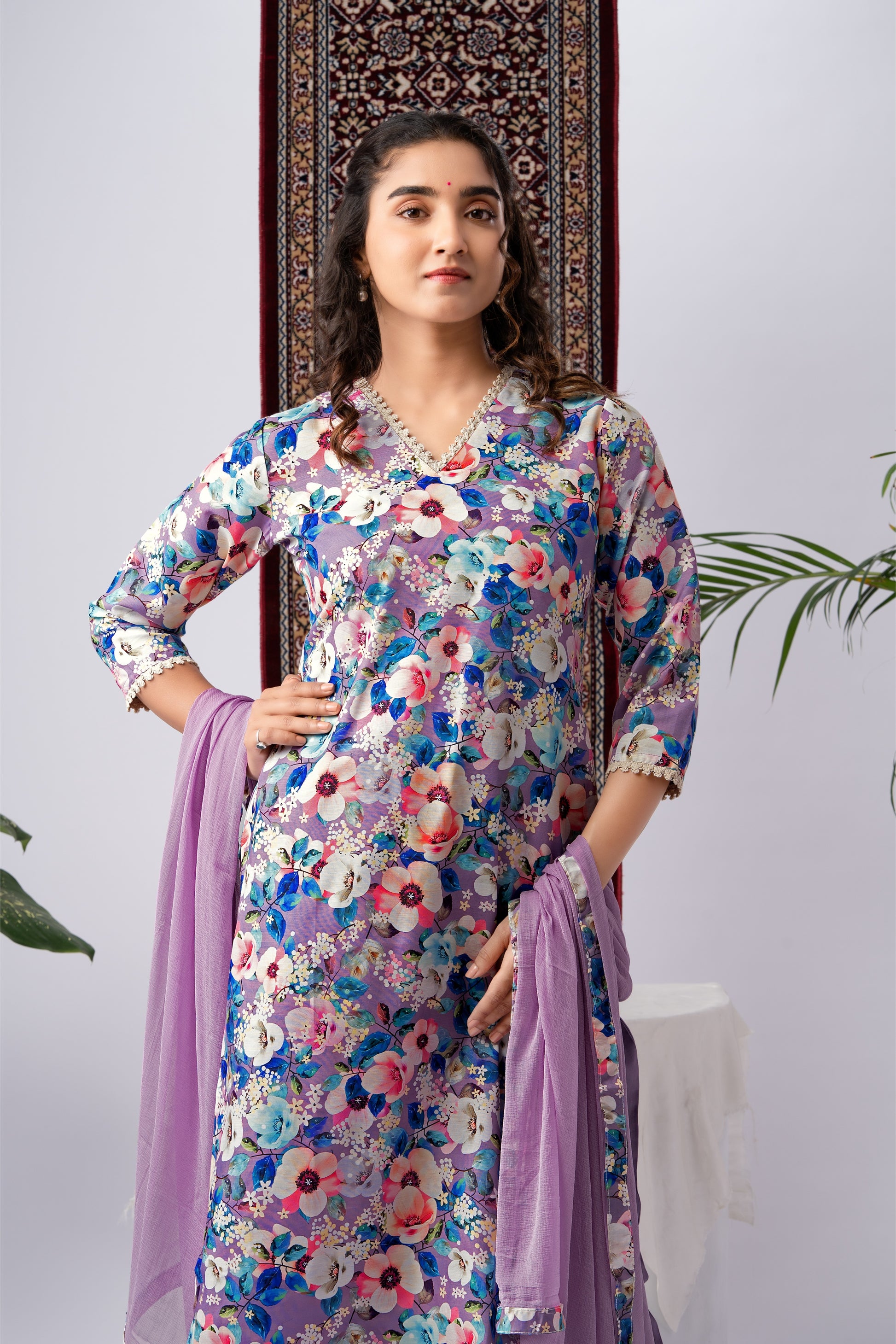 Lavender Cotton Blend Kurta Set with Vibrant Floral Print