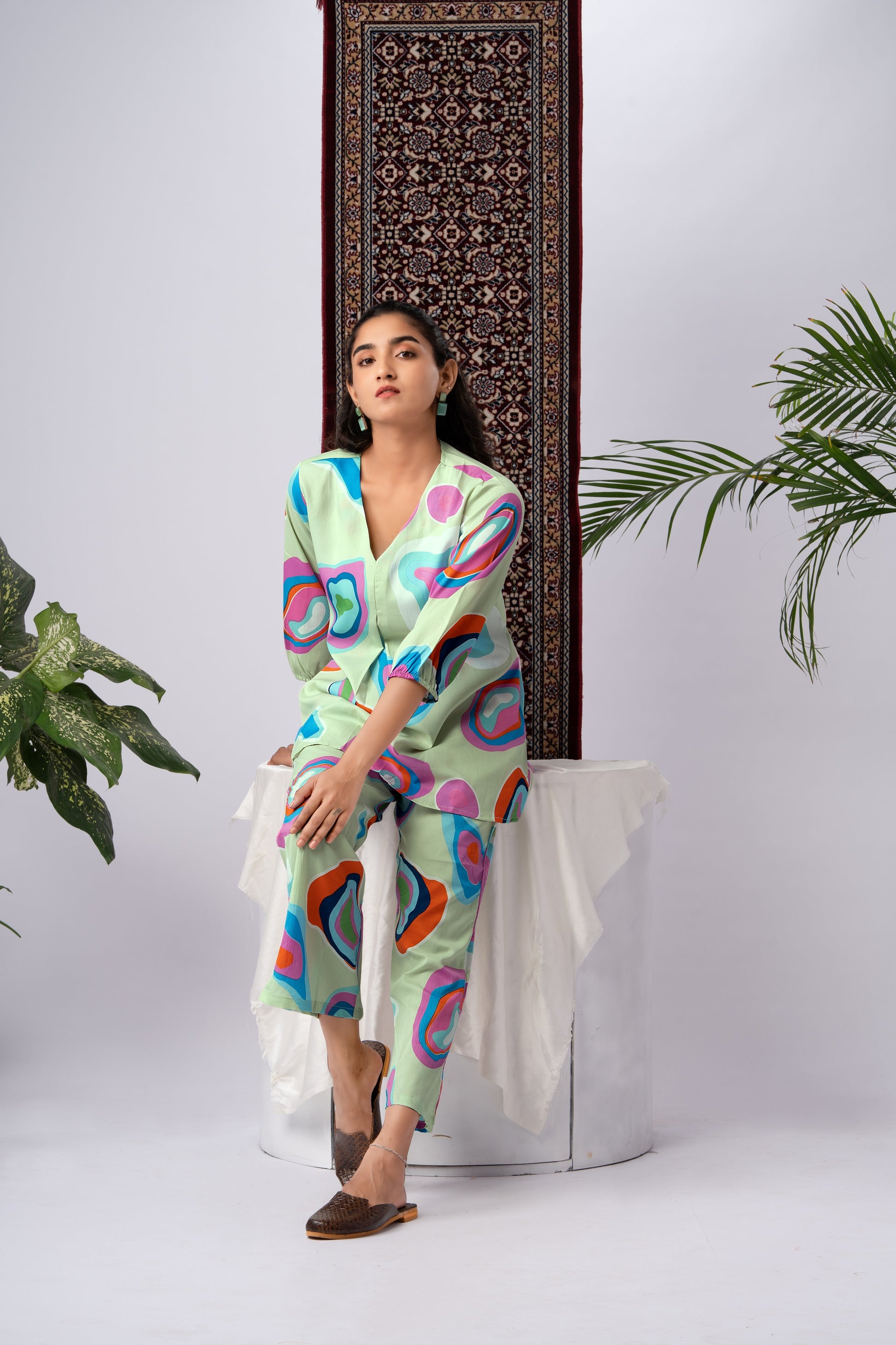 Lime Green Multicolour Abstract Print Silk Blend Co-Ord Set