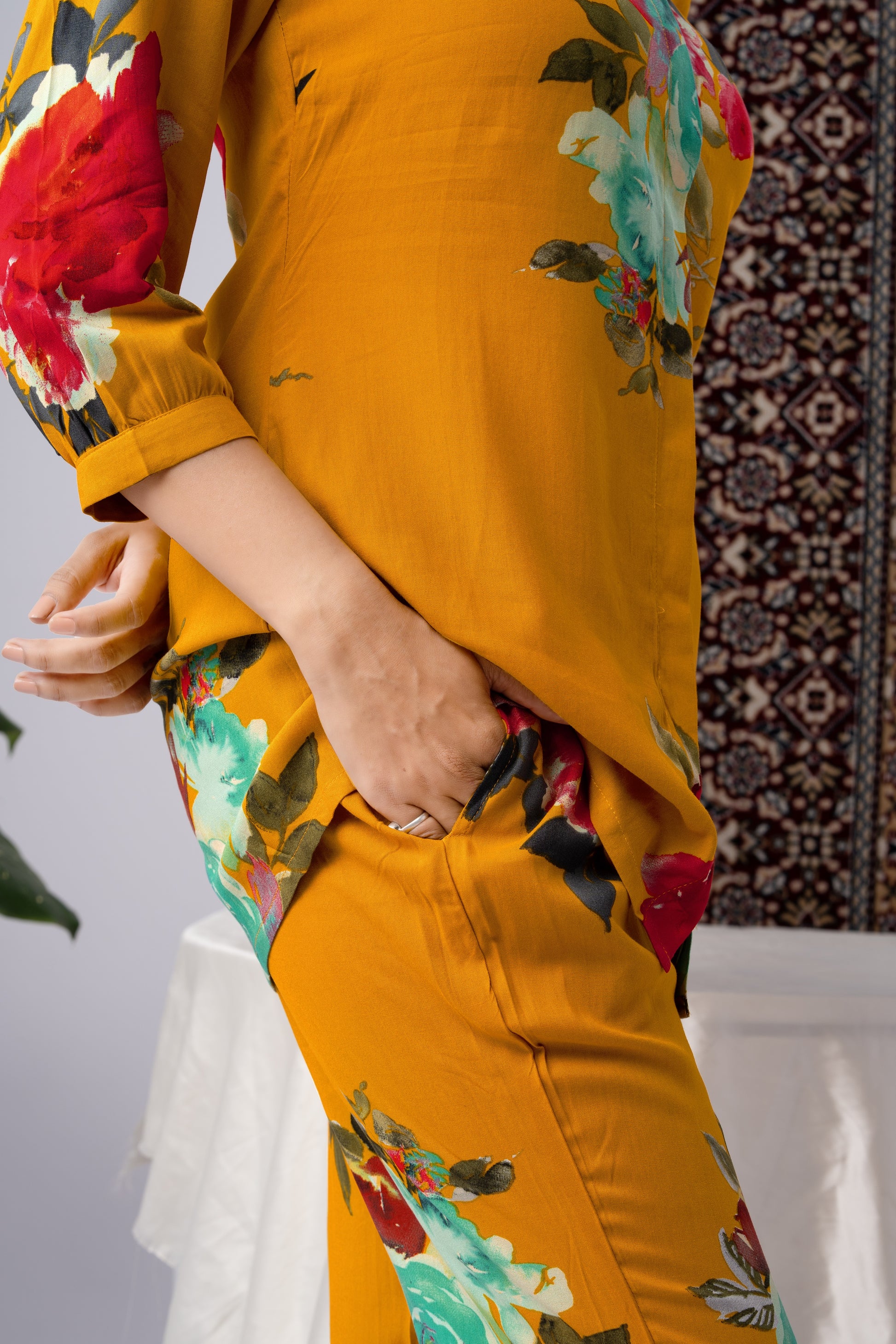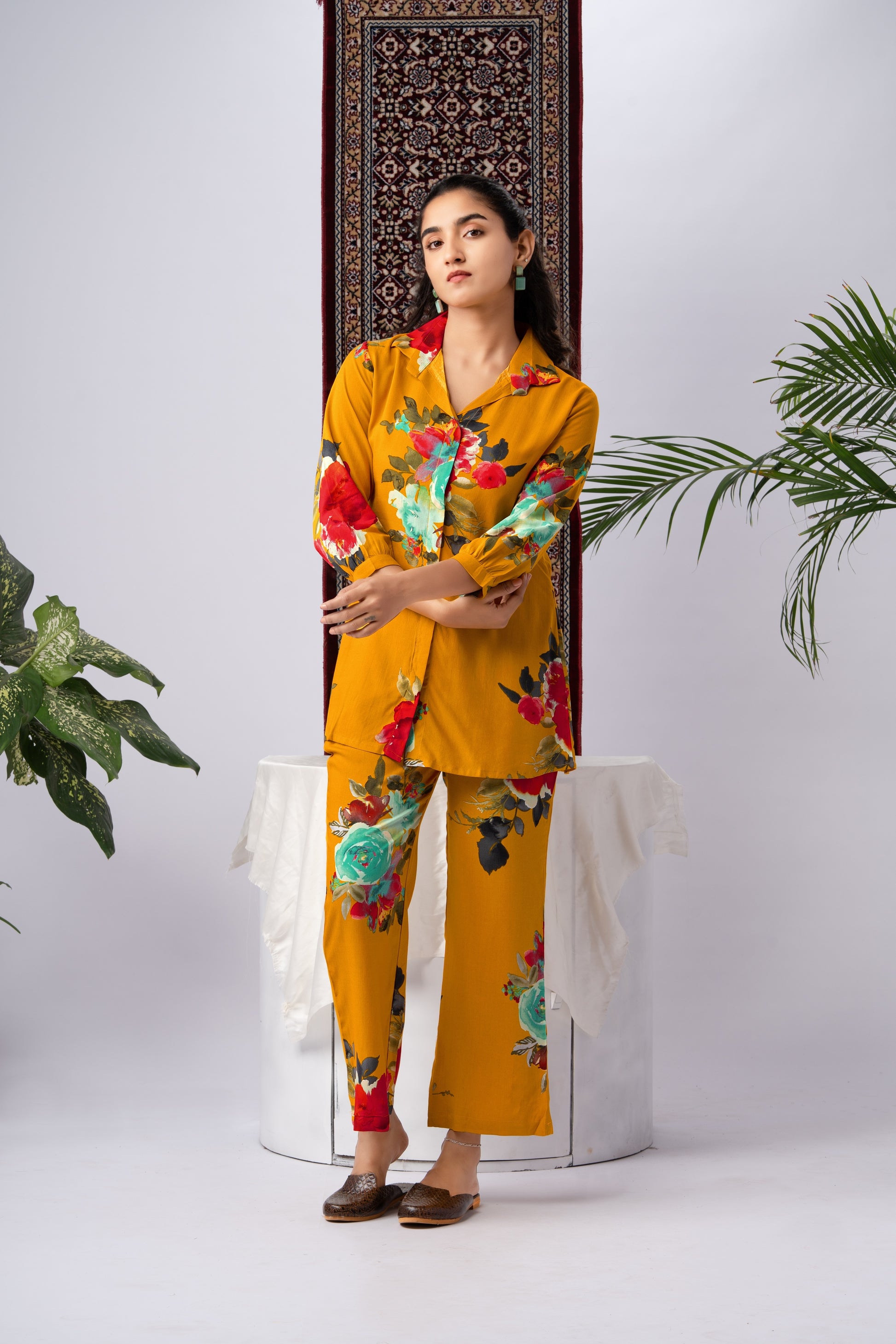 Mustard Yellow Floral Print Silk Blend Co-Ord Set
