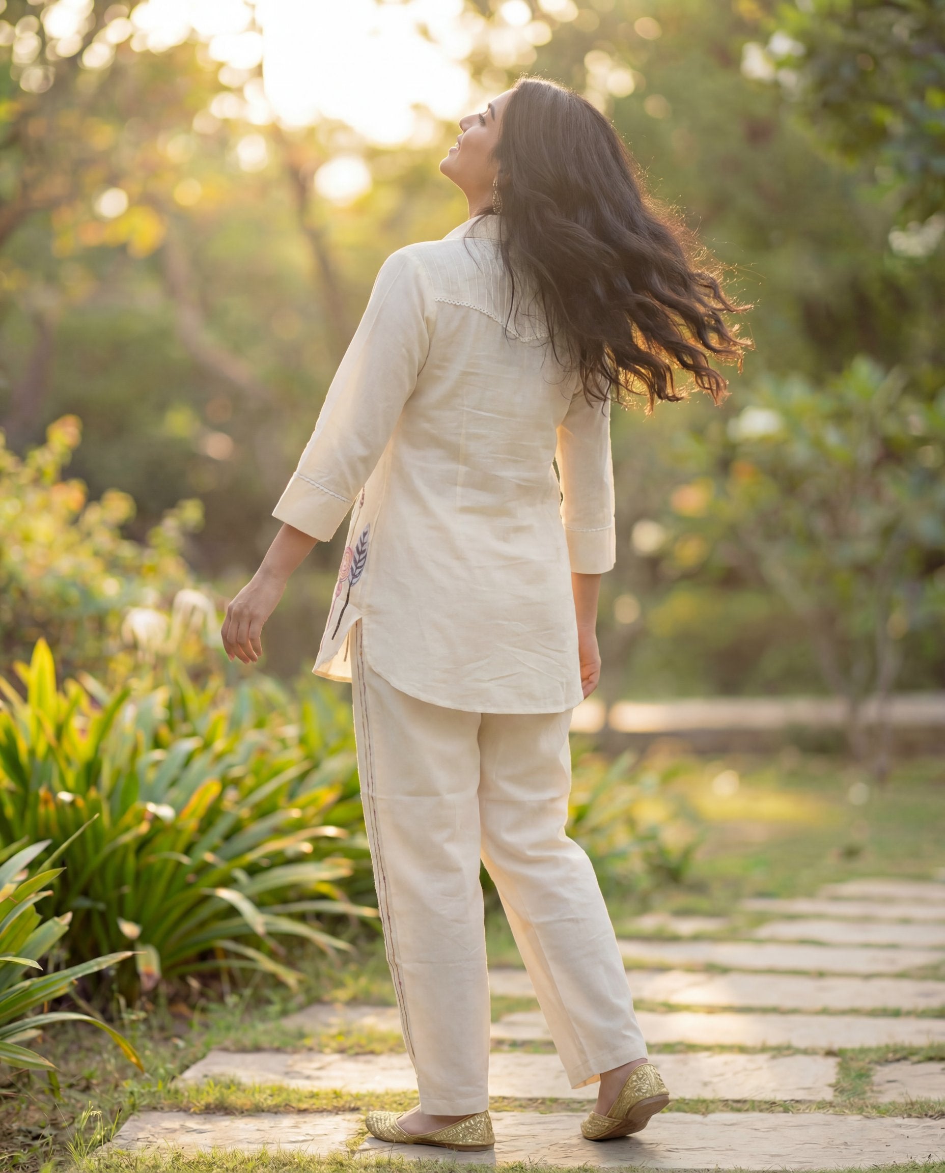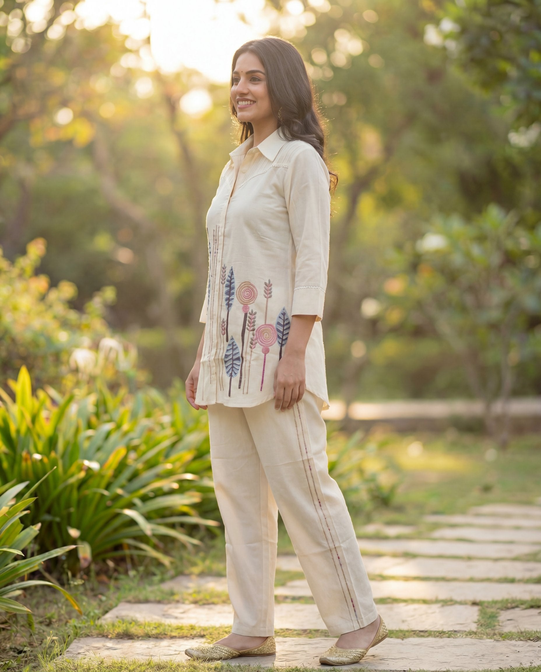 This elegant off-white pure cotton co-ord set features a stylish shirt collar top with front button detailing and subtle lace-style stitch work on the yoke and sleeves. The highlight is the beautiful multi-colour leaf & abstract motif print placed on the lower front side, giving it a modern yet soothing look. Paired with matching cotton trousers, this co-ord set is perfect for daily wear and classy casual outings.