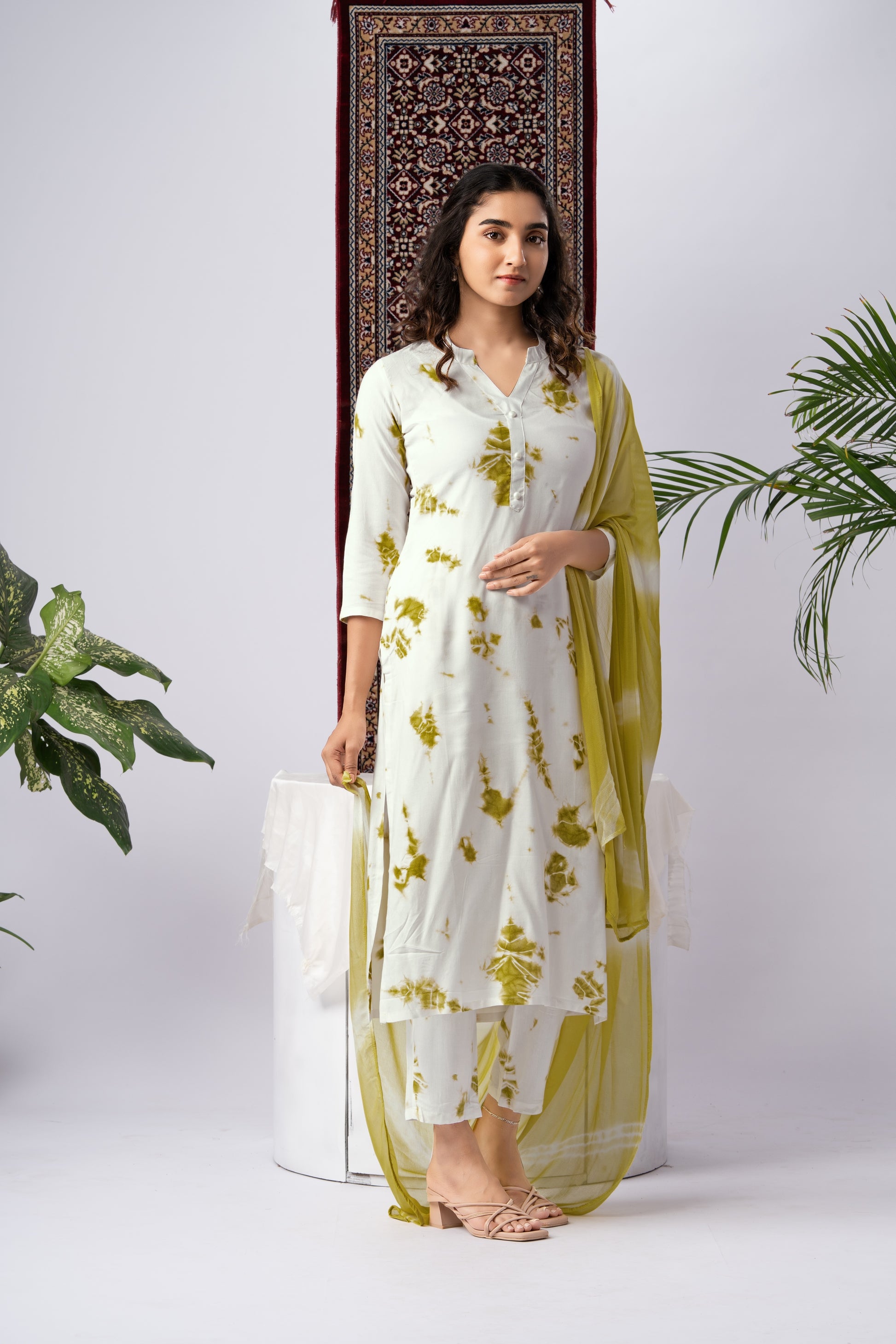 White & Yellow Tie-Dye Print Rayon Kurta Set with Dupatta